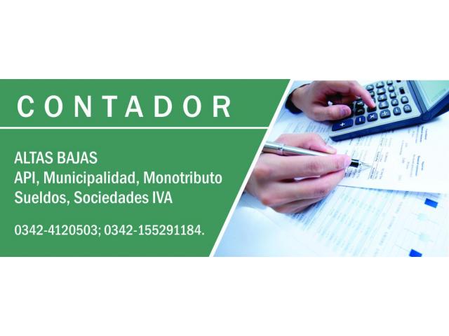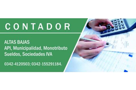 AB ALTAS BAJAS: API, Municipalidad. Monotributo. Sueldos. Sociedades IVA. Contador Guillermo Corestein Matrícula Nro 13486. 0342-155291184.